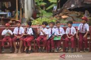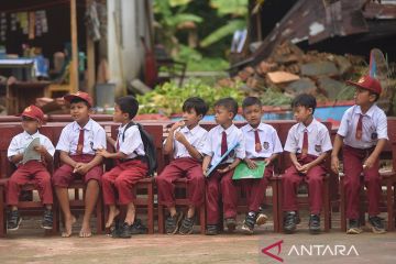 Sejumlah siswa duduk menunggu kedatangan meja dan kursi untuk ujian di SDN 05 Batang Anai, Padang Pariaman, Sumatera Barat, Senin (8/12/2025). Sedikitnya 94 siswa di sekolah itu terpaksa mengikuti kegiatan belajar-mengajar dan ujian di bawah tenda BNPB karena gedung sekolah mereka hancur akibat banjir bandang dan longsor yang terjadi pada Kamis (27/11/2025). ANTARA FOTO/Iggoy el Fitra/rwa.
