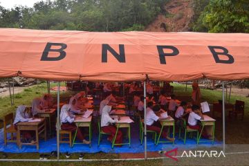 Sejumlah siswa mengikuti ujian di bawah tenda, di SDN 05 Batang Anai, Padang Pariaman, Sumatera Barat, Senin (8/12/2025). Sedikitnya 94 siswa di sekolah itu terpaksa mengikuti kegiatan belajar-mengajar dan ujian di bawah tenda BNPB karena gedung sekolah mereka hancur akibat banjir bandang dan longsor yang terjadi pada Kamis (27/11/2025). ANTARA FOTO/Iggoy el Fitra/rwa.