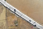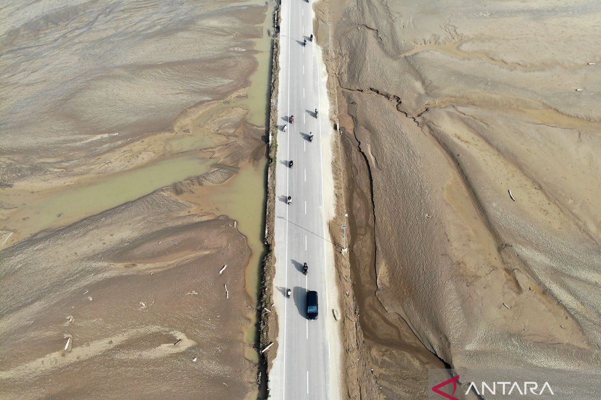 Kendaraan melintas di jalan yang berada di antara lahan pertanian yang rusak akibat terendam banjir dan lumpur banjir bandang di Pidie Jaya, Aceh, Senin (8/12/2025). Berdasarkan data sementara posko tanggap darurat bencana Aceh pada 7 Desember menyebutkan kerusakan lahan pertanian di provinsi Aceh akibat bencana hidrometeorologi yang terjadi sejak 25 November lalu telah mencapai 65 ribu hektare lebih. ANTARA FOTO/Irwansyah Putra/YU