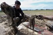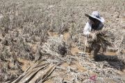 Petani menyelamatkan padi pascapanen yang terendam banjir bandang di Pidie Jaya, Aceh, Senin (8/12/2025). Berdasarkan data sementara posko tanggap darurat bencana Aceh pada 7 Desember menyebutkan kerusakan lahan pertanian di provinsi Aceh akibat bencana hidrometeorologi yang terjadi sejak 25 November lalu telah mencapai 65 ribu hektare lebih. ANTARA FOTO/Irwansyah Putra/YU