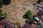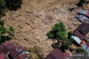 Foto udara tumpukan gelondongan kayu di permukiman di Tabiang Bandang Gadang, Nanggalo, Padang, Sumatera Barat, Selasa (9/12/2025). Gelondongan kayu yang terbawa banjir bandang sejak dua pekan lalu masih tersangkut di wilayah itu. ANTARA FOTO/Iggoy el Fitra/nz