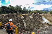 Petugas menggunakan alat berat membersihkan gelondongan kayu yang menutupi aliran sungai Aek Garoga pascabencana banjir bandang dan tanah longsor di Kabupaten Tapanuli Tengah, Sumatera Utara, Kamis (11/12/2025). Sulitnya akses menuju lokasi dan terbatasnya alat berat membuat proses pembersihan gelondongan batang kayu terhambat sehingga menyulitkan proses evakuasi serta pencarian korban bencana banjir bandang. ANTARA FOTO/Muhammad Adimaja/nz