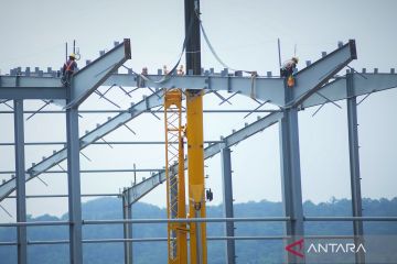 Sejumlah pekerja menyelesaikan pekerjaannya dalam pembangunan salah satu bangunan industri di Kawasan Ekonomi Khusus (KEK) Industropolis Batang, Kabupaten Batang, Jawa Tengah, Senin (15/12/2025). Menteri koordinator Bidang Perekonomian Airlangga Hartarto menyebut Kawasan Ekonomi Khusus (KEK) turut menjadi penggerak pertumbuhan ekonomi Kabupaten Batang dan Kendal dengan catatatan kinerja ekonomi tumbuh hingga 8 persen jauh di atas rata-rata provinsi maupun nasional. ANTARA FOTO/Harviyan Perdana Putra/bar