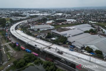Foto udara suasana pengerjaan proyek pembangunan Jalan Tol Semarang-Demak Seksi 1 di Semarang, Jawa Tengah, Senin (15/12/2025). Kementerian Pekerjaan Umum (PU) mencatat progres konstruksi Jalan Tol Semarang-Demak Seksi 1 sepanjang 10,64 Km dengan dukungan sistem pengendali banjir seperti tanggul laut, rumah pompa dan sejumlah kolam retensi selain untuk memperlancar arus lalu lintas juga untuk melindungi ratusan ribu jiwa dari ancaman banjir rob Kabupaten Demak dan Kota Semarang tersebut telah mencapai 58,31 persen per 24 November 2025 dan ditargetkan beroperasi pada April 2027. ANTARA FOTO/Aprillio Akbar/bar