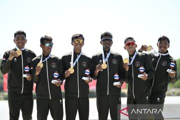 Tim dayung putra Indonesia (dari kiri) M iqbal, Ali Mardiansyah, Ihram, Rafiq Wijdan Yasir, Ardi Isadi, Kakan Kusmana berpose dengan medali emasnya usai upacara penghargaan pemenang (UPP) final nomor Quadruple Sculls dayung SEA Games 2025 di Royal Thai Navy Rowing and Canoeing Training Center, Ban Chang, Rayong, Chon Buri, Thailand, Selasa (16/12/2025). Indonesia berhasil menjadi yang tercepat dengan catatan waktu 6 menit 38,862 detik sehingga berhak atas medalli emas sedangkan medali perak diraih Vietnam dengan catatan waktu 6 menit 43,678 detik dan Thailand meraih medali perunggu dengan catatan waktu 6 menit 48,319 detik. ANTARA FOTO/Nova Wahyudi/tom.