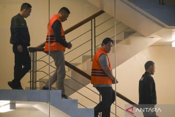 Kepala Kejaksaan Negeri (Kajari) Hulu Sungai Utara (HSU) Albertinus Parlinggoman Napitupulu (kedua kanan) bersama Kepala Seksi Intelijen (Kasi Intel) Kejari HSU Asis Budianto (kedua kiri) berjalan mengenakan rompi tahanan usai terjaring operasi tangkap tangan (OTT) di Gedung Merah Putih KPK, Jakarta, Sabtu (20/12/2025). KPK menahan Albertinus Parlinggoman Napitupulu dan Asis Budianto setelah ditetapkan sebagai tersangka kasus dugaan tindak pidanq korupsi pemerasan dalam proses penegakan hukum di Kejari HSU. ANTARA FOTO/Hafidz Mubarak A/agr
