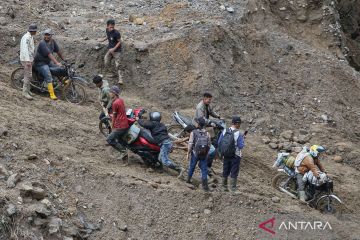 Warga mengangkat sepeda motor saat menyeberangi sungai wilayah Tenge Besi, Kecamatan Pintu Rime Gayo, Kabupaten Bener Meriah, Aceh, Sabtu (20/12/2025). Akses warga pejalan kaki masih harus melintasi jembatan darurat dari batang kayu dan kendaraan roda dua harus menyeberangi arus sungai saat debit air surut, sementara roda empat tidak dapat melintas, akibat jalan dan jembatan penghubung antara Bener Meriah menuju Takengon, Kabupaten Aceh Tengah putus diterjang banjir bandang pada Rabu (26/11). ANTARA FOTO/Khalis Surry/nym.