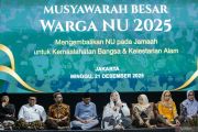 Penggagas Musyawarah Besar Warga NU Inayah Wahid (keempat kanan) bersama Lukman Hakim (kiri), Marzuki Wahid (kedua kiri), Ahmad Munjid (ketiga kiri), Helmi Ali (keempat kiri), Masrucha (ketiga kanan), Cici Farhah (kedua kanan) dan Maya Dina (kanan) menyampaikan keterangan usai Musyawarah Besar Warga NU di Ciganjur, Jakarta, Minggu (21/12/2025). Dalam musyawarah besar Warga NU yang mengusung tema Mengembalikan NU kepada Jamaah untuk Kemaslahatan Bangsa dan Kelestarian Alam menghasilkan seruan untuk mempercepat pelaksanaan Muktamar ke-35 NU yang memiliki kekuatan hukum dan legal apabila tidak tercapai maka diselenggarakan Muktamar Luar Biasa (MLB) serta jabatan Rais Aam dan Ketua Umum PBNU bersih dari politik dan intervensi pihak luar. ANTARA FOTO/Asprilla Dwi Adha/nz