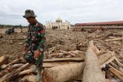 Prajurit TNI melintasi gelondongan kayu yang sedang dibersihkan di pesantren Islam Terpadu Darul Mukhlishin, Desa Tanjung Karang, Aceh Tamiang, Aceh, Minggu (21/12/2025). Kementerian Kehutanan bersama TNI membersihkan gelondongan kayu dan lumpur yang terbawa arus banjir bandang akibat luapan sungai Tamiang sebagai upaya pemulihan pascabencana yang terjadi 26 November 2025. ANTARA FOTO/Irwansyah Putra/nz