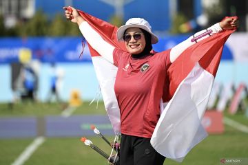Pemanah Indonesia Diananda Choirunisa membentangkan bendera Merah Putih usai mengalahkan pemanah Vietnam Huyen Diep Trieu pada final nomor panahan Recurve perorangan Putri SEA Games 2025 di Football Field 1, Sport Authority of Thailand, Hua Mak, Bang Kapi, Bangkok, Thailand, Rabu (17/12/2025). Diananda meraih medali emas setelah mengalahkan pemanah Vietnam Huyen Diep Trieu dengan skor 6-4. ANTARA FOTO/Nova Wahyudi/nz