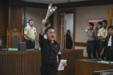 Direktur Eksekutif Lokataru Delpedro Marhein (kedua kanan) bersiap menjalani sidang pembacaan dakwaan di PN Jakarta Pusat, Jakarta, Selasa (16/12/2025). Terdakwa Delpedro Marhein, Muzaffar Salim, Syahdan Husein, dan Khariq Anhar didakwa melakukan penghasutan dengan mengunggah konten media sosial terkait aksi demonstrasi pada Agustus 2025 yang berujung kericuhan. ANTARA FOTO/Hafidz Mubarak A/nz