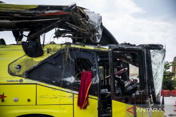 Kondisi bangkai bus PO Cahaya Trans bernomor polisi B 7201 IV pascakecelakaan terparkir di kawasan Gerbang Tol Muktiharjo, Semarang, Jawa Tengah, Senin (22/12/2025). Berdasarkan data posko gabungan Natal 2025 dan Tahun Baru 2026 mencatat 16 penumpang meninggal dunia dan 18 penumpang lainnya mengalami luka-luka imbas kecelakaan tunggal bus PO Cahaya Trans rute Jatiasih-Yogyakarta tersebut pada Senin (22/12) dini hari. ANTARA FOTO/Aprillio Akbar/sgd