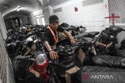 Petugas merapikan motor penumpang peserta layanan Angkutan Motor Gratis dengan Kereta Api (Motis) di dalam gerbong kereta api di Stasiun Pasar Senen, Jakarta, Selasa (23/12/2025). Direktorat Jenderal Perkeretaapian (DJKA) Kementerian Perhubungan memberangkatkan sebanyak 333 orang peserta dan 357 motor menggunakan layanan Motis menuju Semarang Tawang dan Purwosari, Jawa Tengah pada Masa Natal 2025 dan Tahun Baru 2026. ANTARA FOTO/Sulthony Hasanuddin/rwa.