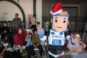 Maskot Si Motis menyapa calon penumpang yang menunggu kereta api di Stasiun Pasar Senen, Jakarta, Selasa (23/12/2025). Direktorat Jenderal Perkeretaapian (DJKA) Kementerian Perhubungan memberangkatkan 333 orang peserta dan 357 motor menggunakan layanan Angkutan Motor Gratis dengan Kereta Api (Motis) menuju Semarang Tawang dan Purwosari, Jawa Tengah pada Masa Natal 2025 dan Tahun Baru 2026. ANTARA FOTO/Sulthony Hasanuddin/rwa.