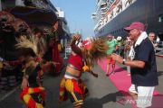 Bujang Ganong menari bersama wisatawan yang turun dari kapal pesiar MV Westerdam di Dermaga Jamrud Utara, Pelabuhan Tanjung Perak, Surabaya, Jawa Timur, Rabu (24/12/2025). Kapal pesiar berbendera Belanda itu membawa 1.899 penumpang dari mancanegara untuk berkunjung di tempat wisata di Surabaya, Sidoarjo dan Mojokerto, dan kunjungan kapal pesiar tersebut merupakan kunjungan kapal pesiar terakhir di Surabaya di tahun 2025 dengan jumlah total 18 kapal pesiar yang telah berkunjung sepanjang tahun 2025. ANTARA FOTO/Didik Suhartono/nym.
