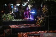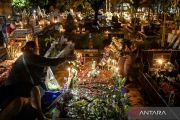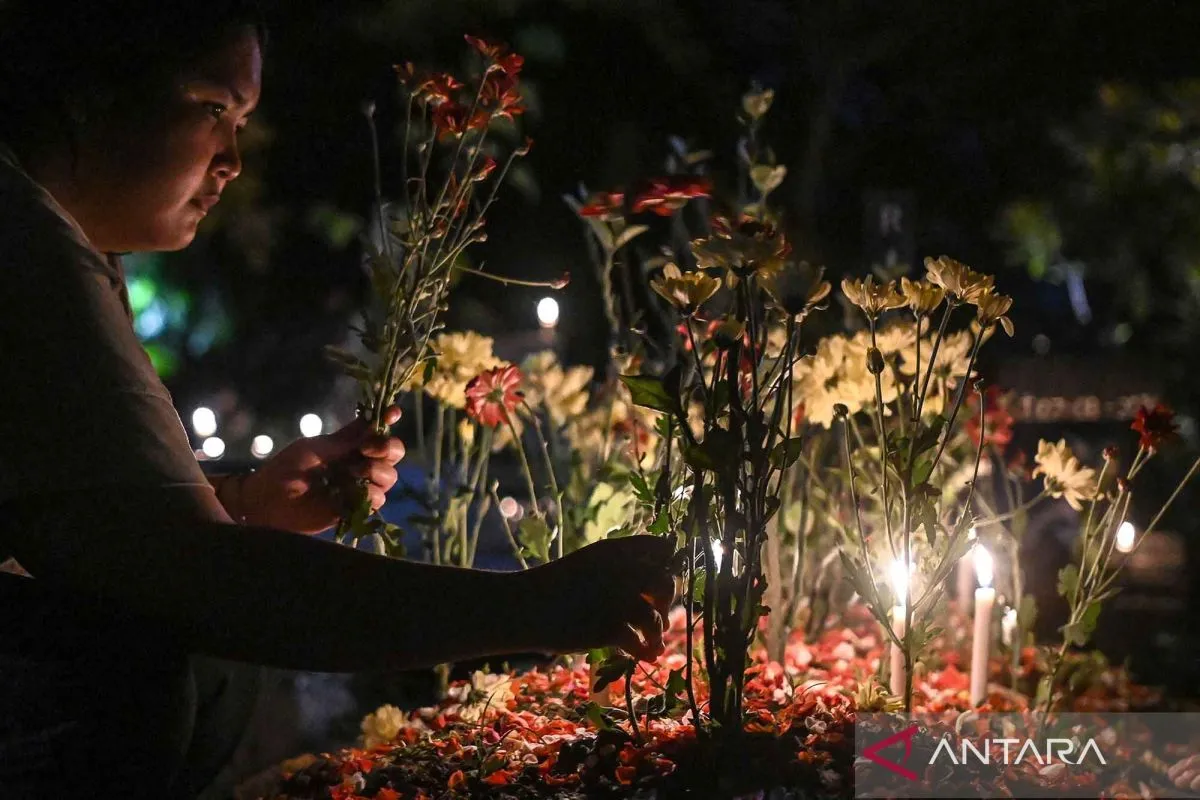 Warga keturunan Portugis menyalakan lilin dan menaruh bunga saat ziarah ke makam anggota keluarga saat malam Natal di kompleks Gereja Protestan Indonesia Barat (GPIB) Tugu, Semper Barat, Cilincing, Jakarta, Rabu (24/12/2025). Ziarah makam tersebut sudah menjadi tradisi keluarga keturunan Portugis di Kampung Tugu sebagai bentuk penghormatan dan mendoakan anggota keluarga yang telah wafat. ANTARA FOTO/Sulthony Hasanuddin/nym.