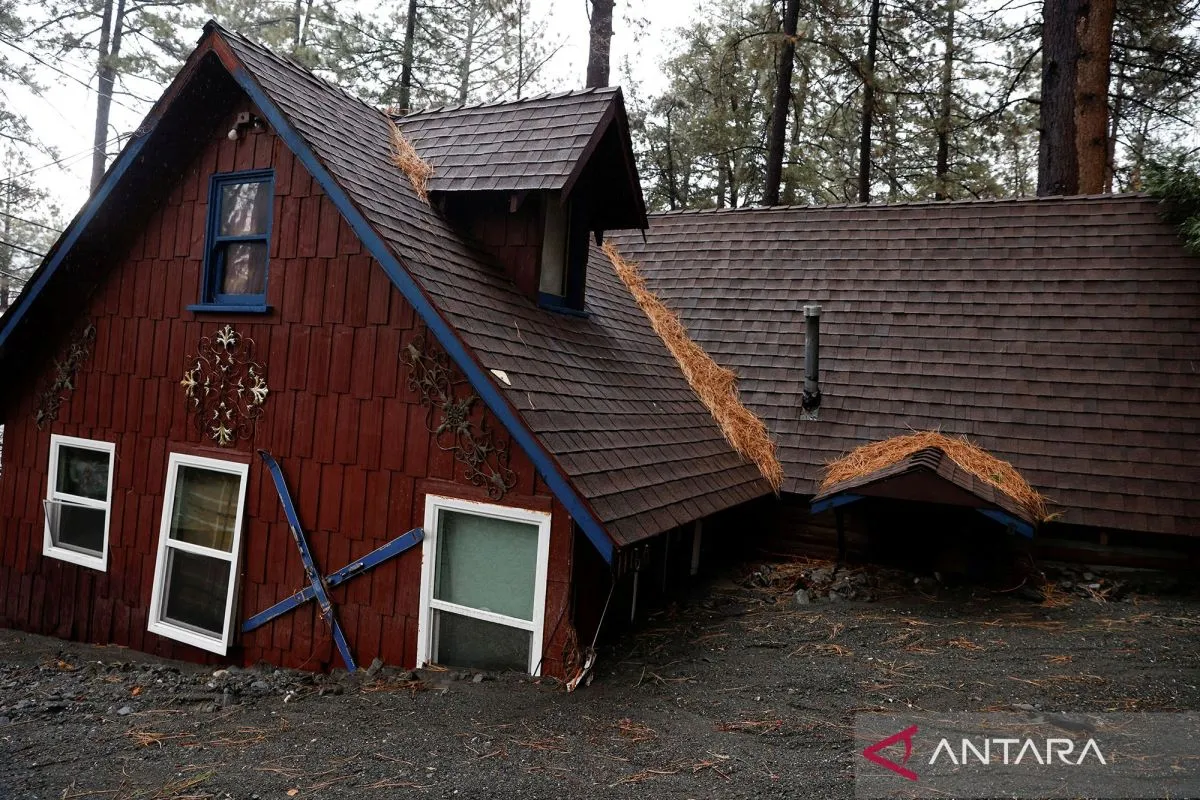 Sebuah rumah tertimbun lumpur yang disebabkan banjir bandang di Wrightwood, California, Amerika Serikat, Jumat (27/12/2025). Badai dahsyat dan banjir bandang menerjang kawasan tersebut pada Hari Raya Natal sehingga menyebabkan sejumlah rumah dan kendaraan tertimbun lumpur. ANTARA FOTO/Reuters/Jill Connelly/bar