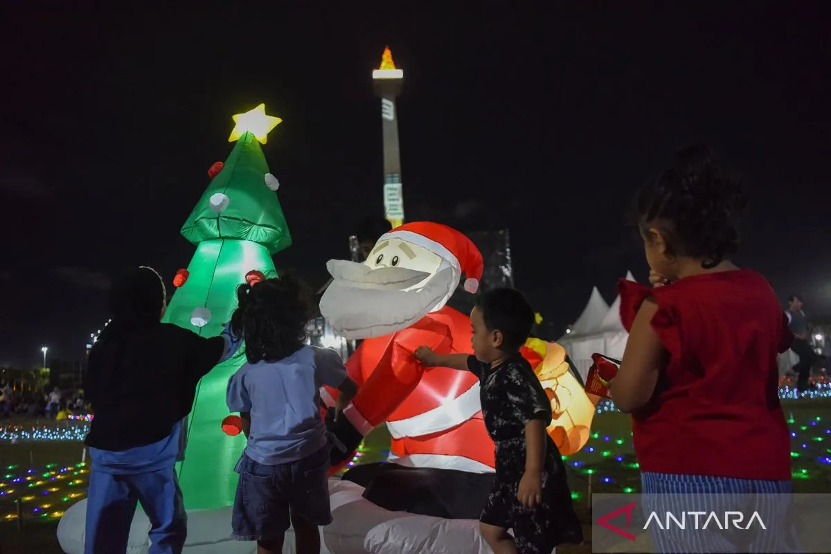 Pengunjung melihat ornamen Natal di sela sajian video mapping di Monas, Jakarta, Jumat (26/12/2025). Di masa liburan cuti bersama Natal, Pemprov DKI Jakarta menggelar sajian video mapping dan air mancur menari untuk menghibur pengunjung yang berlangsung selama tiga hari yaitu 25-26 dan 28 Desember 2025 di Monas Week 2025. ANTARA FOTO/Indrianto Eko Suwarso/bar