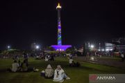Pengunjung menikmati sajian video mapping di Monas, Jakarta, Jumat (26/12/2025). Di masa liburan cuti bersama Natal, Pemprov DKI Jakarta menggelar sajian video mapping dan air mancur menari untuk menghibur pengunjung yang berlangsung selama tiga hari yaitu 25-26 dan 28 Desember 2025 di Monas Week 2025. ANTARA FOTO/Indrianto Eko SuwarsoANTARA FOTO/Indrianto Eko Suwarso/bar