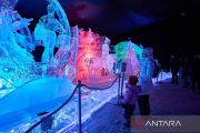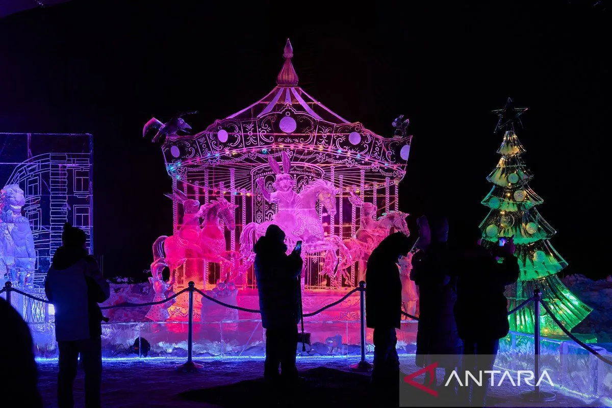 Orang-orang mengunjungi Festival Patung Es di St. Petersburg, Rusia, Sabtu (27/12/2025) waktu setempat. Festival tersebut menampilkan patung es dari berbagai karakter kartun dan bangunan. ANTARA FOTO/Xinhua/Guo Feizhou/tom.