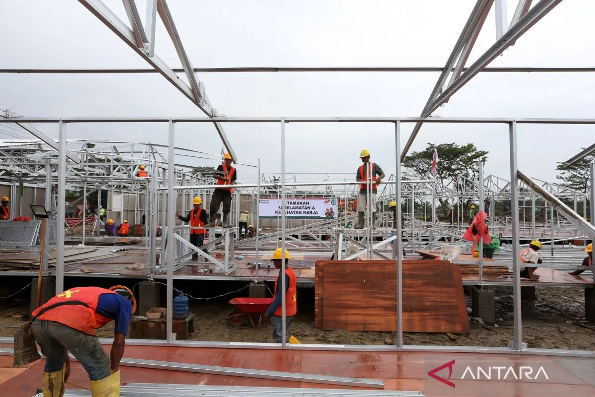 Pekerja membangun hunian sementara (huntara) untuk korban bencana banjir bandang di Karang Baru, Aceh Tamiang, Aceh, Minggu (28/12/2025). Pemerintah Kabupaten Aceh Tamiang telah menyiapkan 14 titik lahan HGU milik sejumlah perkebunan untuk lokasi pembangunan huntara dengan ukuran 4,5 x 4.5 meter persegi per unit bagi warga korban bencana hidrometeorologi akhir November lalu yang kehilangan rumah atau mengalami rusak berat. ANTARA FOTO/Irwansyah Putra/wpa.