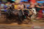 Joki memacu sapinya saat gelaran karapan sapi sakak di Kabupaten Probolinggo, Jawa Timur, Sabtu (27/12/2025). Pemerintah Kabupaten Probolinggo menggelar karapan sapi sakak yang diikuti 34 peserta sebagai ajang promosi wisata di kawasan itu. ANTARA FOTO/Irfan Sumanjaya/nym.