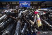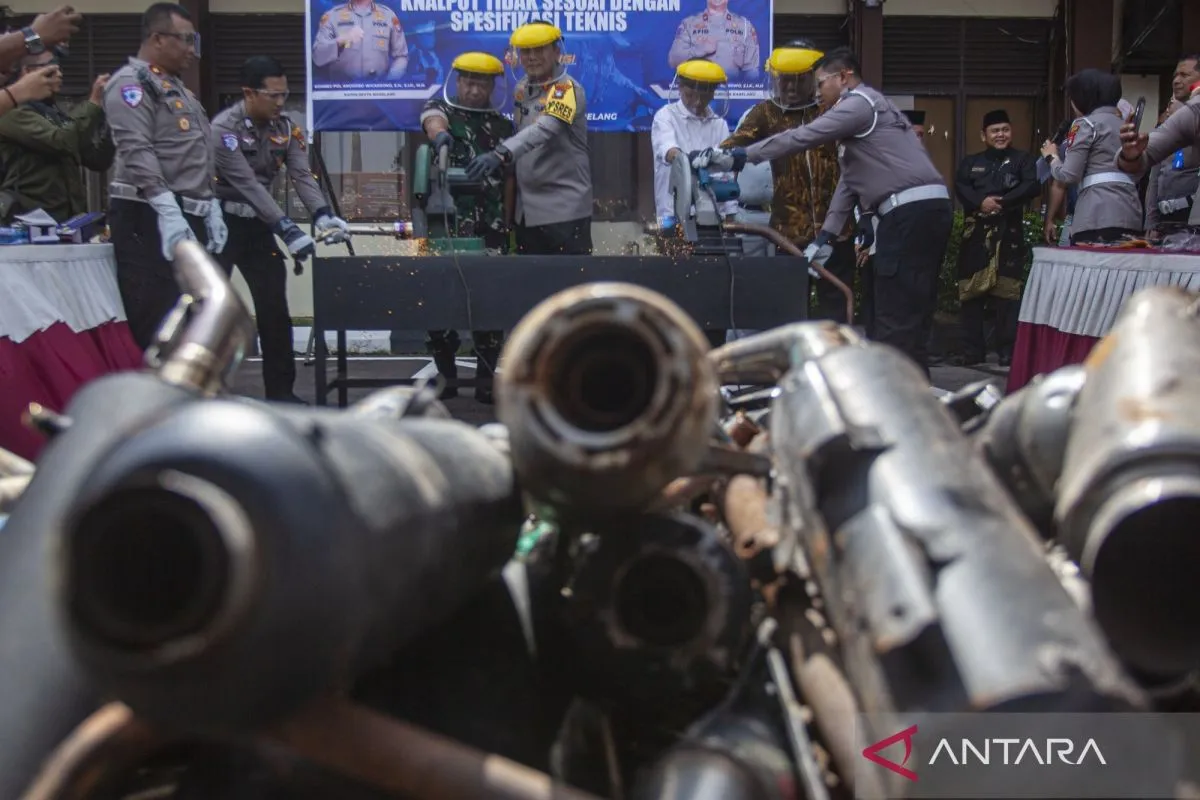 Petugas Kepolisian memotong knalpot brong saat pemusnahan barang bukti dalam rilis akhir tahun di Polresta Barelang, Batam, Kepulauan Riau, Selasa (30/12/2025). Polresta Barelang memusnahkan sebanyak 506 knalpot tidak sesuai standar hasil penindakan pelanggaran lalu lintas sepanjang tahun 2025 sebagai upaya menjaga ketertiban dan kenyamanan masyarakat. ANTARA FOTO/Teguh Prihatna/nz