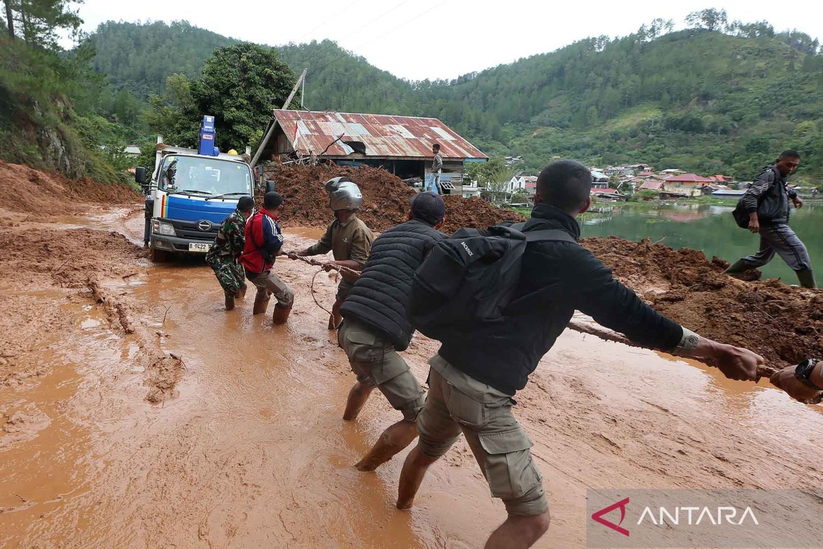 Warga membantu menarik mobil PLN yang terjebak longsor susulan di jalan lintas Takengon-Bintang di One-One, Aceh Tengah, Aceh, Jumat (2/1/2026). Badan Penanggulangan Bencana Daerah (BPBD) Kabupaten Aceh Tengah menyiapkan dan mengerahkan alat berat di lokasi rawan bencana longsor untuk mengantisipasi keterisolasian daerah dan memperlancar jalur transportasi darat di daerah itu. ANTARA FOTO/Irwansyah Putra/nym.