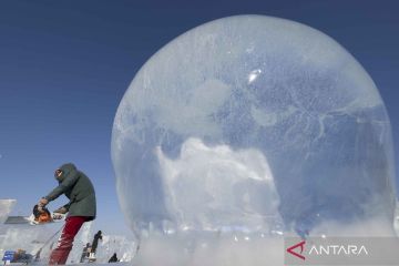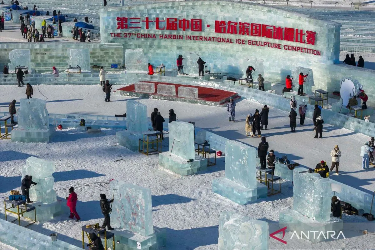 Foto udara yang diambil menggunakan drone memperlihatkan para peserta menyelesaikan pembuatan patung es dalam Kompetisi Patung Es Internasional Harbin ke-37 di Harbin Ice-Snow World, Provinsi Heilongjiang, China timur laut, Jumat (2/1/2026). ANTARA FOTO/Xinhua/Zhang Tao/nym.