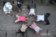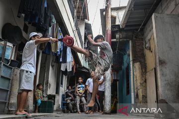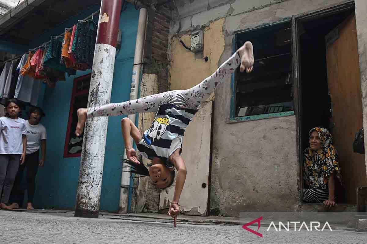 Anak-anak berlatih gerakan akrobatik capoeira di gang sempit Jalan Pluit Dalam III, Penjaringan, Jakarta, Kamis (8/1/2026). Pelatih sekaligus pendiri Komunitas Indosalto, Yoga Ardian memberikan pelatihan olahraga akrobatik capoeira secara gratis sebagai kegiatan positif bagi sekitar 10-20 anak di kawasan tersebut hingga tiga diantaranya telah meraih prestasi di tingkat nasional. ANTARA FOTO/Sulthony Hasanuddin/rwa.