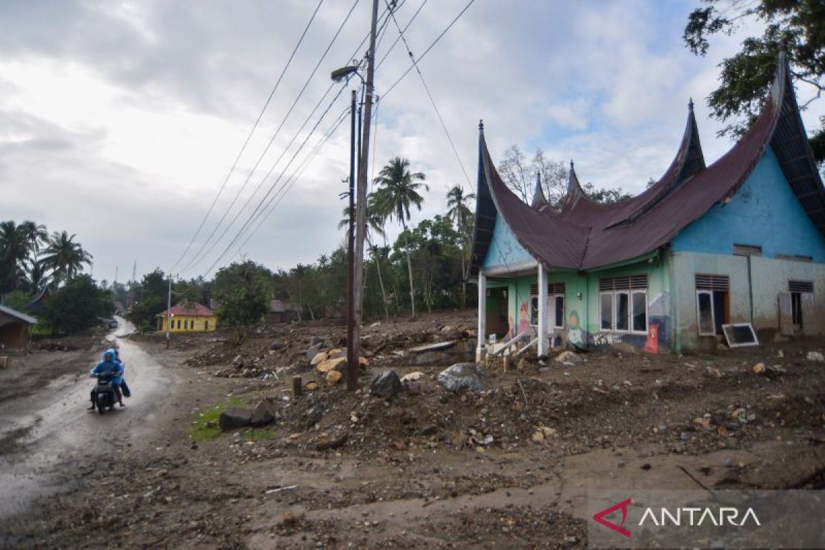 Warga melintas di kawasan terdampak banjir bandang di Tanjung Sawah, Nagari Padang Laweh, Tanah Datar, Sumatera Barat, Sabtu (10/1/2026). Pemkab Tanah Datar mengusulkan kebutuhan anggaran pemulihan pascabencana ke pemerintah pusat sekitar Rp1,4 triliun mencakup sektor infrastruktur lebih dari Rp1,3 triliun, sektor perumahan sekitar Rp92,9 miliar, sektor ekonomi Rp49 miliar, sektor sosial lebih dari Rp6,7 miliar dan lintas sektor lebih dari Rp10 miliar. ANTARA FOTO/Iggoy el Fitra/bar