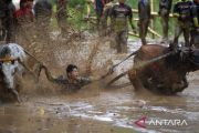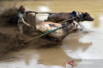 Joki memacu sapinya saat atraksi Pacu Jawi di areal pesawahan Nagari Batu Basa, Tanah Datar, Sumatera Barat, Sabtu (10/1/2026). Pacu Jawi kembali digelar awal tahun 2026 setiap bulannya bergantian antarkecamatan sebagai upaya meneruskan tradisi masyarakat setempat sekaligus menarik minat wisatawan untuk berkunjung ke Tanah Datar pascabencana. ANTARA FOTO/Iggoy el Fitra/tom.