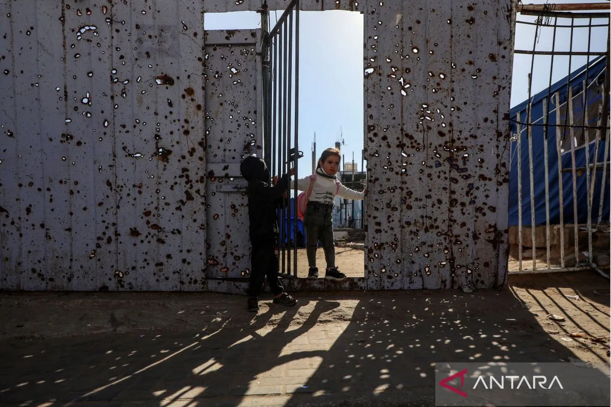 Dua siswa berada di Sekolah Al-Shamal Educational yang berjarak hanya 100 meter dari âGaris Kuningâ (Yellow Line) di Kamp Pengungsi Jabalia, Jalur Gaza utara, (12/1//2026). Garis itu memisahkan Gaza ke dalam dua zona, yakni area timur yang berada di bawah pengawasan militer Israel dan area barat di mana warga Palestina dapat beraktivitas dengan pembatasan yang lebih sedikit. ANTARA FOTO/Xinhua/Rizek Abdeljawad/sgd