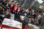 Hakim ketua Tipikor Efendi (kanan) memeriksa barang bukti berupa mobil Ferrari untuk terdakwa kasus dugaan suap terhadap putusan lepas perkara korupsi pemberian fasilitas ekspor minyak sawit mentah (CPO) Ariyanto Bakri (kiri) dan Marcella Santoso (tengah) di Pengadilan Tipikor, Jakarta, Rabu (14/1/2026). Jaksa Penuntut Umum (JPU) menghadirkan barang berupa mobil Ferrari, dua sepeda motor Harley Davidson dan satu sepeda road bike untuk perkara korupsi korporasi penerima fasilitas ekspor crude palm oil (CPO) sekaligus kasus tindak pidana pencucian uang (TPPU). ANTARA FOTO/Muhammad Adimaja/bar