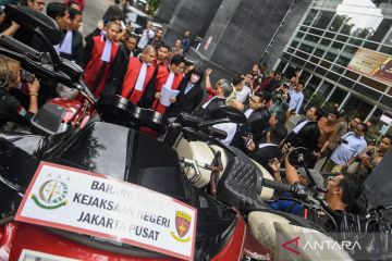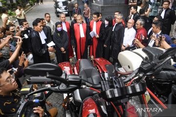 Majelis Hakim tipikor memeriksa barang bukti berupa sepeda motor Harley Davidson untuk Terdakwa kasus dugaan suap terhadap putusan lepas perkara korupsi pemberian fasilitas ekspor minyak sawit mentah (CPO) Ariyanto Bakri dan Marcella Santoso di Pengadilan Tipikor, Jakarta, Rabu (14/1/2026). Jaksa Penuntut Umum (JPU) menghadirkan barang berupa mobil Ferrari, dua sepeda motor Harley Davidson dan satu sepeda road bike untuk perkara korupsi korporasi penerima fasilitas ekspor crude palm oil (CPO) sekaligus kasus tindak pidana pencucian uang (TPPU). ANTARA FOTO/Muhammad Adimaja/bar