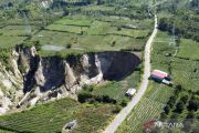 Foto udara suasana perkebunan milik warga yang amblas di jalan lintas Kecamatan Desa Pondok Balik, Kecamatan Ketol, Aceh Tengah, Aceh, Selasa (14/1/2026). Fenonema tanah amblas tersebut berada di pinggir jalan lintas penghubung Kabupaten Aceh Tengah dan Kabupaten Bener Meriah. ANTARA FOTO/Abiyyu/bar