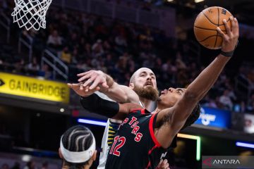 Pebasket Toronto Raptors Collin Murray-Boyles (12) berusaha melepas tembakan dihalangi pemain Indiana Pacers Jay Huff dalam laga NBA di Gainbridge Fieldhouse, Indianapolis, Indiana, AS, Rabu (14/1/2026). Raptors menang dengan skor 115-101. ANTARA FOTO/Trevor Ruszkowski-Imagn ImagesIMAGN IMAGES via Reuters Connect/foc.