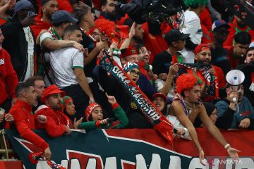Pendukung kesebelasan Maroko merayakan kemenangan timnya atas Nigeria melalui adu penalti dalam laga semifinal Piala Afrika 2025 di Prince Moulay Abdellah Stadium, Rabat, Maroko, Rabu (14/1/2026). Maroko menang 4-2 dalam adu penalti dan melangkah ke final untuk menghadapi Senegal. ANTARA FOTO/REUTERS/Siphiwe Sibeko/foc.