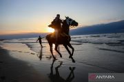 Warga Palestina menunggang seekor kuda di pantai saat matahari terbenam di Kota Gaza, Jumat (16/1/2026). ANTARA FOTO/Rizek Abdeljawad/Xinhua/wsj.