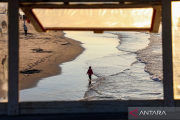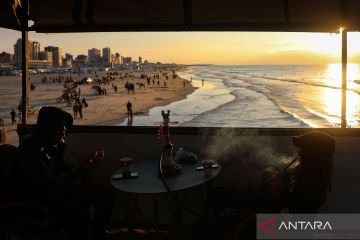 Warga Palestina meluangkan waktunya bermain di pantai saat matahari terbenam di Kota Gaza, Jumat (16/1/2026). ANTARA FOTO/Rizek Abdeljawad/Xinhua/wsj.