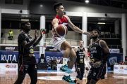 Pebasket Rajawali Medan Jordan Oei (tengah) diadang dua pebasket Satya Wacana Salatiga Henry Cornelis Lakay (kiri) dan Serigne Modou Kane (kanan) saat melakukan lay up pada pertandingan Indonesian Baskeball League (IBL) 2026 di GOR Basket Prof. Dr. dr. Susilo Wibowo, Semarang, Jawa Tengah, Jumat (16/1/2026). Rajawali Medan menang dengan skor 76-60. ANTARA FOTO/Aprillio Akbar/wsj.