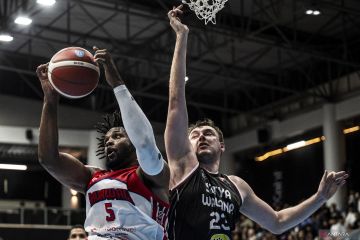 Pebasket Rajawali Medan Antonio Kurtis Hester (kiri) berebut bola rebound dengan pebasket Satya Wacana Salatiga Serhii Pavlov (kanan) saat pertandingan Indonesian Baskeball League (IBL) 2026 di GOR Basket Prof. Dr. dr. Susilo Wibowo, Semarang, Jawa Tengah, Jumat (16/1/2026). Rajawali Medan menang dengan skor 76-60. ANTARA FOTO/Aprillio Akbar/wsj.