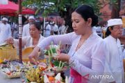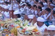 Pemuka agama Hindu memberikan bija atau butiran beras kepada umat Hindu saat persembahyangan Hari Suci Siwaratri di Pura Agung Jagatnatha, Denpasar, Bali, Sabtu (17/1/2026). Persembahyangan yang digelar setiap setahun sekali untuk memuja Dewa Siwa tersebut merupakan hari perenungan diri yang jatuh pada bulan Januari 2026 sebagai momentum bagi umat Hindu untuk introspeksi diri dan memohon pengampunan atas perbuatan buruk yang telah dilakukan guna meningkatkan kualitas hidup menjadi lebih baik. ANTARA FOTO/Nyoman Hendra Wibowo/tom.