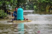 Warga menggunakan rakit stirofoam melewati banjir di Desa Karangligar, Telukjambe, Karawang, Jawa Barat, Senin (19/1/2026). Berdasarkan data BPBD Karawang, banjir yang dipicu curah hujan tinggi serta meluapnya Sungai Sungai Citarum dan Sungai Cibeet berdampak kepada 6.596 warga di 13 kecamatan. ANTARA FOTO/Darryl Ramadhan/bar
