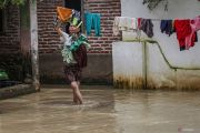 Warga mengangkat pakaian saat banjir di Desa Pantai Bakti, Muara Gembong, Kabupaten Bekasi, Jawa Barat, Selasa (20/1/2026). BPBD Kabupaten Bekasi mencatat banjir tersebut disebabkan curah hujan yang tinggi dan meluapnya Sungai Cibeet dan Citarum itu berdampak kepada 17.563 kepala keluarga (KK) dari 33 desa di 15 kecamatan. ANTARA FOTO/Darryl Ramadhan/YU