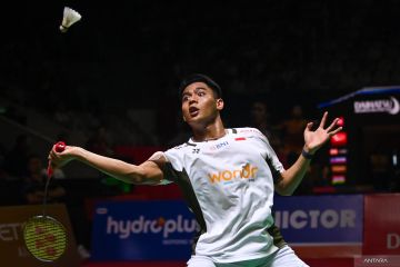 Pebulu tangkis Indonesia M. Zaki Ubaidillah mengembalikan kok ke arah pebulu tangkis India Kiran George pada babak 32 besar tunggal putra Daihatsu Indonesia Masters 2026 di Istora Senayan, Jakarta, Rabu (21/1/2026). Pebulu tangkis yang akrab disapa Ubed tersebut berhasil melaju ke babak 16 besar setelah menang dua gim langsung 21-17, 21-14 ANTARA FOTO/Aditya Pradana Putra/foc.