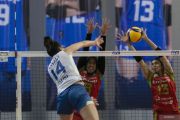 Pevoli Bandung BJB Tandamata Sonaly Cidrao (kiri) melakukan smes yang coba diblok pevoli Jakarta Pertamina Enduro Megawati Hangestri Pertiwi (kedua kanan) dan Rissa Meiga Rianti (kanan) pada pertandingan Putaran Pertama Minggu Ketiga Proliga 2026 di GOR Sabilulungan Jalak Harupat, Kabupaten Bandung, Jawa Barat, Kamis (22/1/2026). Bandung BJB Tandamata berhasil mengalahkan Jakarta Pertamina Enduro dengan skor 3-2 (16-25,25-22,22-25,25-18,15-8). ANTARA FOTO/Abdan Syakura/YU