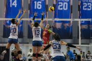 Pevoli Jakarta Pertamina Enduro Iana Shcherban (kanan) melakukan smes yang coba diblok pevoli Bandung BJB Tandamata Shintia Alliva Mauludina (kiri) dan Fitriyani Nurjanah (kedua kiri) pada pertandingan Putaran Pertama Minggu Ketiga Proliga 2026 di GOR Sabilulungan Jalak Harupat, Kabupaten Bandung, Jawa Barat, Kamis (22/1/2026). Bandung BJB Tandamata berhasil mengalahkan Jakarta Pertamina Enduro dengan skor 3-2 (16-25,25-22,22-25,25-18,15-8). ANTARA FOTO/Abdan Syakura/YU