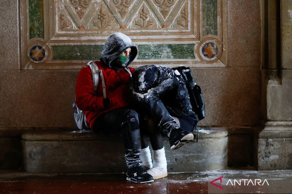 Dua orang duduk berlindung dari badai salju lebat yang menerjang sebagian besar wilayah Amerika Serikat di Kota New York, Amerika Serikat, Minggu (25/1/2026). Menurut Badan Layanan Cuaca Nasional Amerika Serikat, hujan salju lebat dan lapisan es berbahaya diperkirakan terjadi di wilayah yang membentang dari Texas bagian timur hingga Carolina Utara. Keadaan darurat telah diumumkan di 20 lebih negara bagian. ANTARA FOTO/REUTERS/Eduardo Munoz/wsj.
