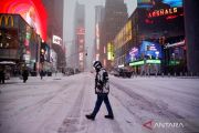 Seorang warga berjalan di kawasan Times Square saat badai salju lebat menerjang sebagian besar wilayah Amerika Serikat di Kota New York, Amerika Serikat, Minggu (25/1/2026). Menurut Badan Layanan Cuaca Nasional Amerika Serikat, hujan salju lebat dan lapisan es berbahaya diperkirakan terjadi di wilayah yang membentang dari Texas bagian timur hingga Carolina Utara. Keadaan darurat telah diumumkan di 20 lebih negara bagian. ANTARA FOTO/REUTERS/Jeenah Moon/wsj.
